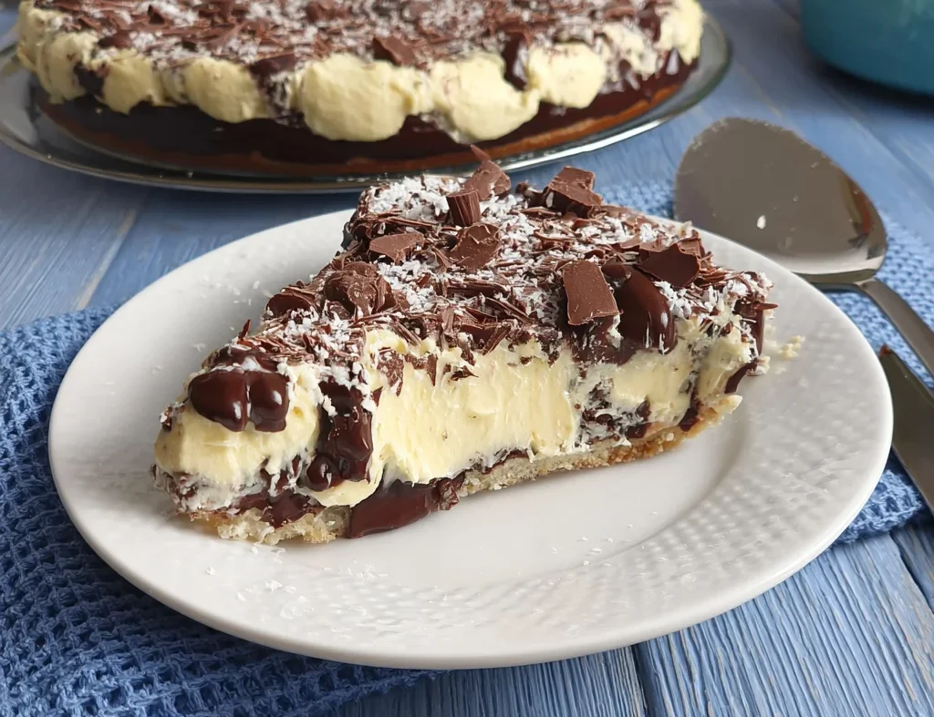 - Step 8: Layer the Cream: Spread the creamy mixture evenly over the bananas on the cookie base. Smooth the surface nicely. Briefly rinse the pot or bowl for the ganache.
