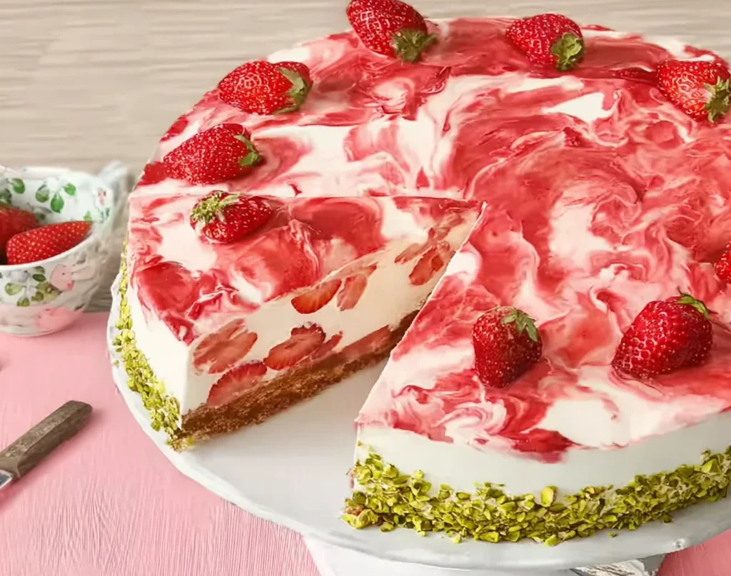 5. Finale und Genuss: Wenn die Torte gut durchgekühlt und fest ist, löse den Tortenring oder den Springformrand vorsichtig mit einem Messer vom Rand der Torte und nimm ihn ab. Jetzt kommt der letzte Schliff! Nimm die gehackten Pistazien und verziere den Rand der Torte damit. Das geht am besten, indem du die Pistazien mit einer Teigkarte oder einem breiten Messer vorsichtig an den Rand drückst. Und voilà! Deine wunderschöne, cremige Rhabarber-Erdbeer-Torte ist fertig!