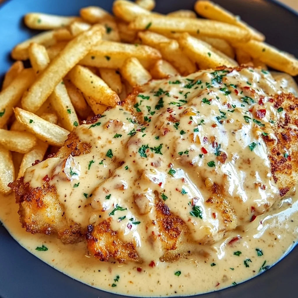 Cremiges Knoblauch-Parmesan Hähnchen mit Pommes Frites