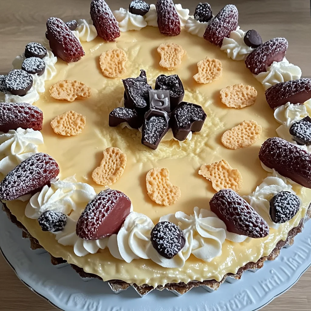 - Step 11: Now place the wafer rolls vertically along the edge on the thin cream layer. Once the entire edge is lined with wafers, carefully fill the remaining egg liqueur cream into the center. Smooth the surface.
