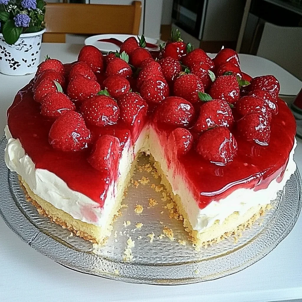 9. Step 9: Strawberry finale: Once the cream is firm, it's time for the strawberries! Wash them, remove the green parts, and cut them into bite-sized pieces as you like. Arrange the strawberries densely on the firm cream and press them down slightly. Prepare the red cake glaze according to package instructions (usually with water and sugar). Carefully pour the warm, but no longer boiling hot glaze over the strawberries. Chill the cake again until the glaze is set.