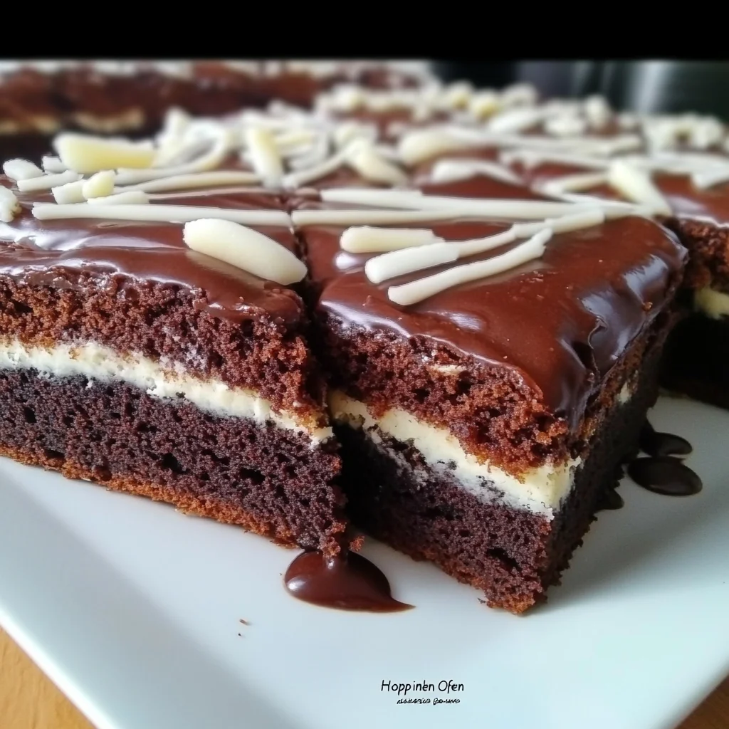 6. Schneiden und genießen: Lass die Glasur etwas fest werden (das dauert ca. 30-60 Minuten bei Raumtemperatur). Dann schneidest du den Kuchen in rechteckige Stücke. Jetzt kannst du zugreifen und ein Stück pure Schokoladenfreude genießen!